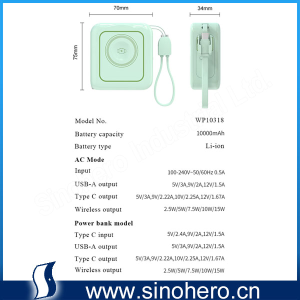 • Output(power bank mode): Wireless:15W,USB-C: PD20W(PPS22.5W), USB-A:QC3.0(18W), C+L+Wireless: Share 5V/3A(15W)